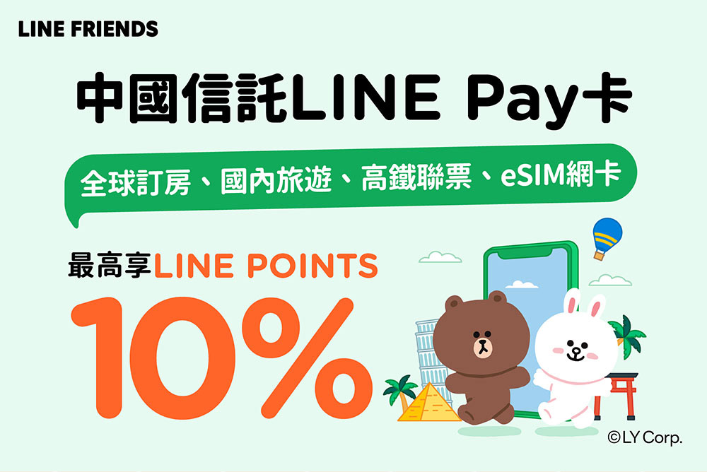 - 1.持中國信託LINE Pay卡至易遊網官網、APP訂購國內旅遊、全球訂房及高鐵聯票商品,即享LINE POINTS 3% 回饋。