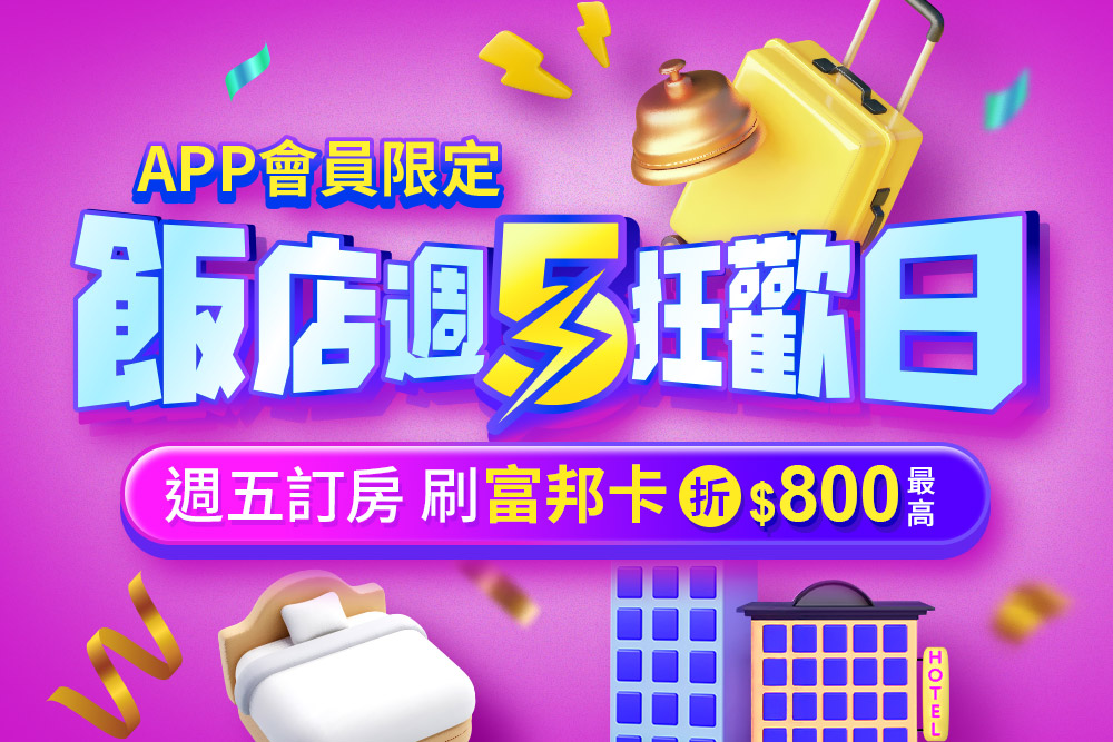 - 週五於APP下單台灣訂房商品,刷富邦信用卡滿2,500折400元。