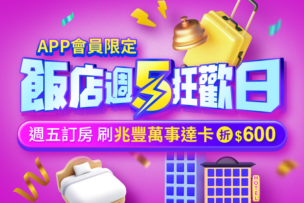 - 週五於APP下單國際訂房商品,刷兆豐萬事達卡連住兩晚以上滿7,900折600元。