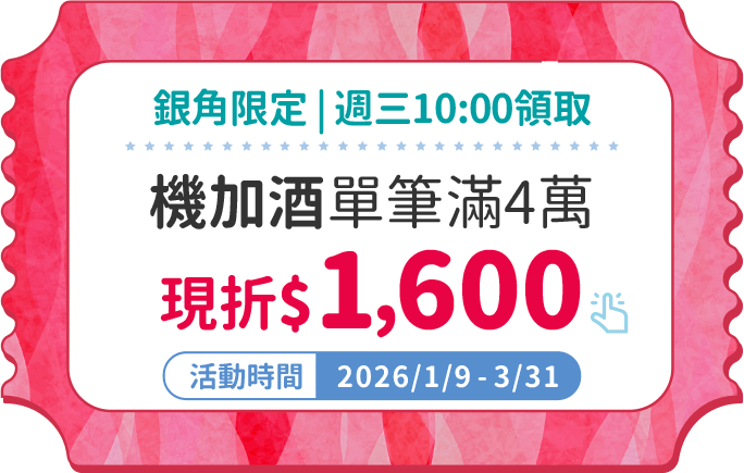 銀角零卡限定折扣碼 : 活動期間下單選銀角零卡支付滿萬元折$600,國際機票依未稅價計算不含行李加購。限2026/6/30前出發,一旦使用,訂單取消亦不可返還。限量500份,數量有限,用完為止。以折扣碼使用先後順序為準,若使用時出現優惠碼兌換完畢,表示已達使用上限。(餐券、電影票、國內機票、環球影城票券商品、延後付款訂單不適用)
